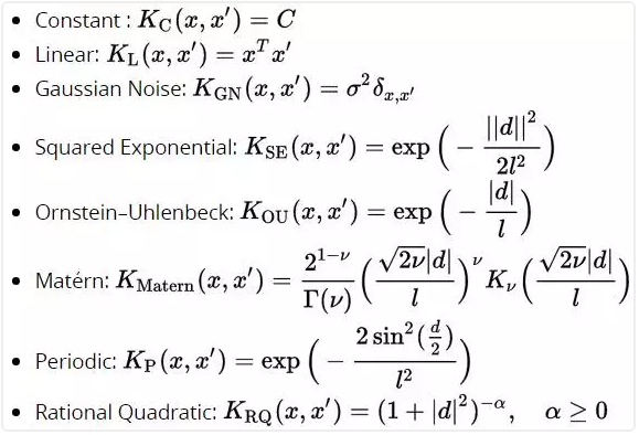 通过一个一元的均值函数以及一个二元的核函数(协方差函数), 我们就能定义一个高斯过程. 常见的核函数如下图: