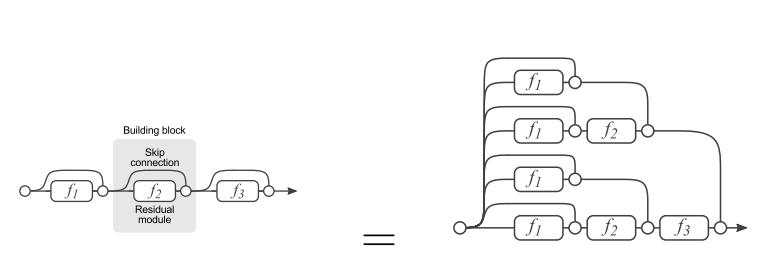 这种skip connection的方式, 可以被分解. 如图中右侧的三层串联的Residual module, 可以被分解成左侧的多种路径组合的网络. 因此, 残差网络其实是很多并行子网络的组合, 整个残差网络其实相当于一个多人投票系统Ensembling.
