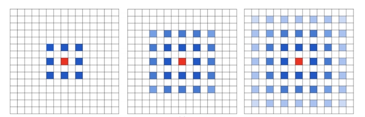 上图是多层3×3空洞卷积核的叠加, 红色为中心, 最左侧红色中心由中心和周围的蓝色点卷积得到, 而蓝色的每个点, 又由他们本身与周围的8个点卷积得到, 也就是发散到了中间的图. 如此继续叠加, 最终红色中心的值由周围若干个点卷积得到, 如右图. 蓝色越深表示卷积权重越大.
